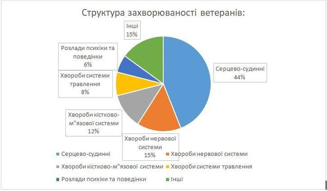 Близько третини (31,1%) ветеранів у кожній області знаходяться на медичному спостереженні (серцево-судинні, неврологічні, психічні захворювання, онкологія).