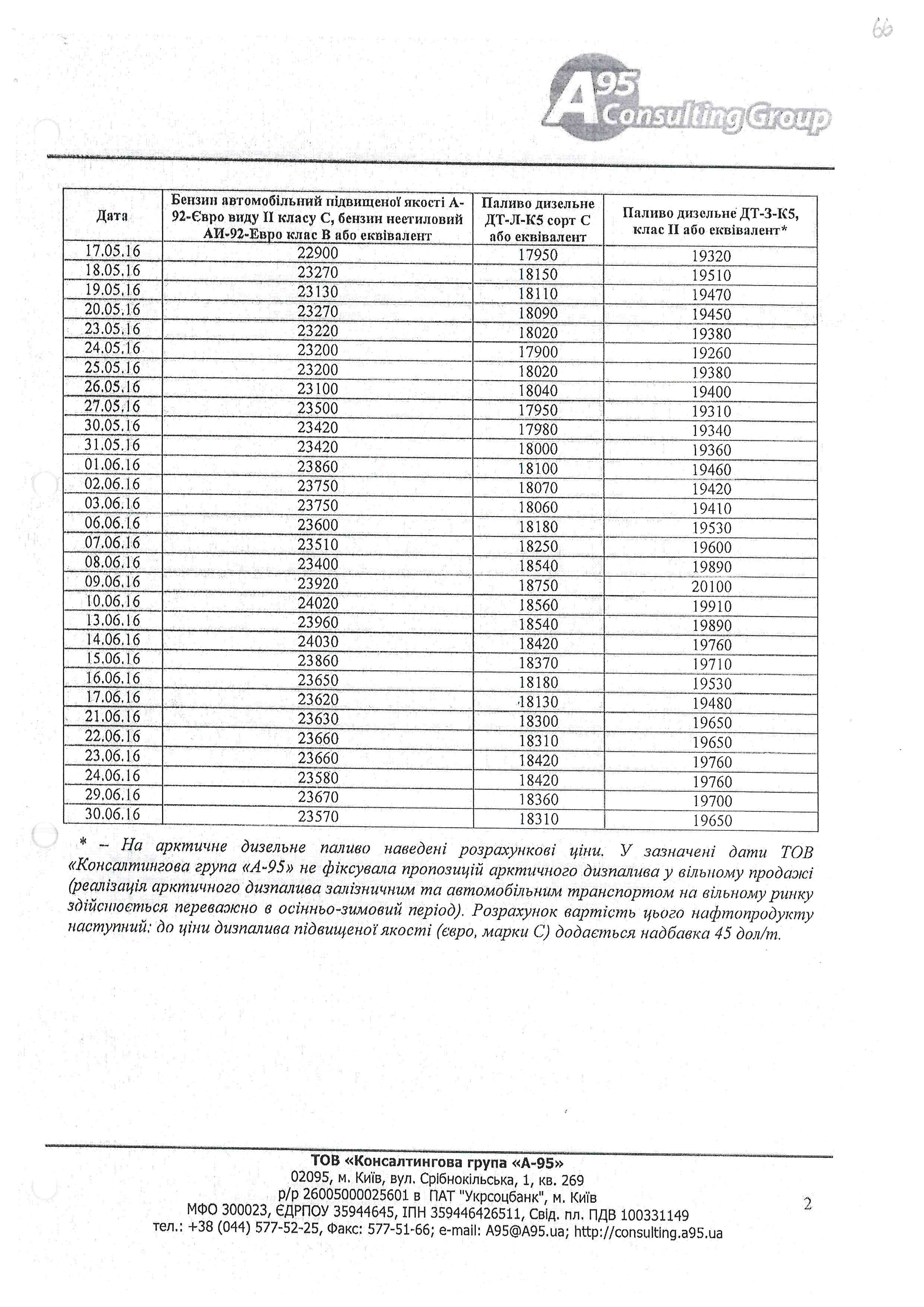 Проте, 16.05 ціни на бензин були підвищені: А-92 - 17,49 грн/літр, дизельне пальне - 15,78 грн/літр. Ще пізніше, 13.09.2016 року, ціна на А-92 підвищена до 19,20 грн, ціна дизельного палива - до 17,6 грн/літр.