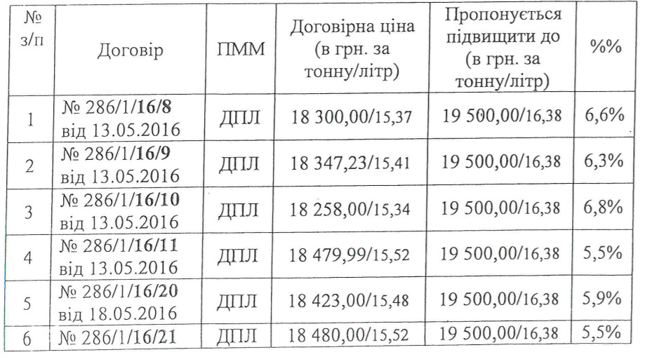 В таблиці з одного з листів ТрейдК, що надсилався до Міноборони, запропоновано зміну ціни на паливо за додатковими угодами від 15.06.2016 року. Останній стовпчик - відсоток, на який змінено ціну у порівнянні із ціною на момент укладення договору: