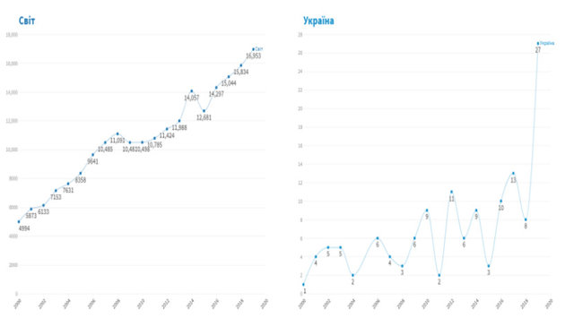 Кількість опублікованих заявок за міжнародною системою PCT: Україна — Світ (джерело — WIPO's IP Statistics Data Center)