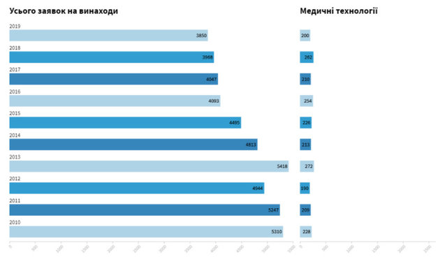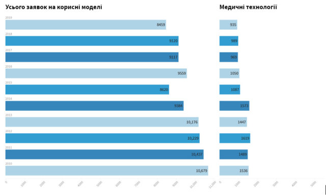Загалом із початку 2010 року до кінця І кварталу 2020 року в Україні подано 2295 заявок на винаходи за напрямом «медична техніка» (медичні технології), що складає майже 5 % від загальної кількості заявок на винаходи за цей період, з урахуванням національних та іноземних заявників. Корисні моделі, відповідаючи загальній тенденції, досі більш привабливі для патентування в Україні, так у категорії «медичні технології» — 12 885 заявок із 2010 року до І кварталу 2020 року. Із урахуванням корисних моделей та винаходів, заявки на медичні технології, в середньому, за останні 5 років (2015–2019 рр), склали 9,46 % від усієї кількості заявок.