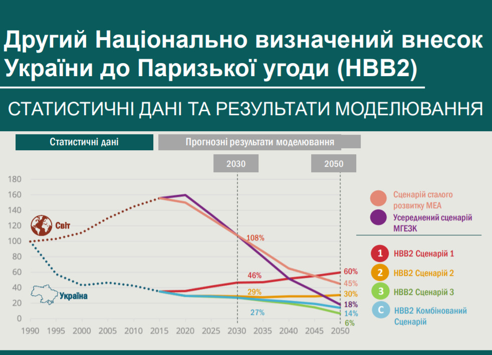 В рамках підготовки другого Національно-визначеного внеску в Паризьку угоду команда експертів ЄБРР та Інституту економіки і прогнозування НАН України провели ґрунтовні розрахунки щодо розвитку економіки за різними сценаріями, обсягів необхідних інвестицій та економічних наслідків. Саме за цим аналізом в уряді наразі тривають консультації стосовно української кліматичної цілі до 2030 року та на 2050 рік. Експерти запропонували для розгляду 4 сценарії: "бізнес як звичайно", сценарій реалізації вже прийнятих цілей і стратегій, сценарій досягнення кліматичної нейтральності до 2050 року і комбінований сценарій, метою якого було згладити значний обсяг інвестицій з 2045-по 2050.