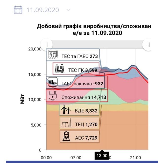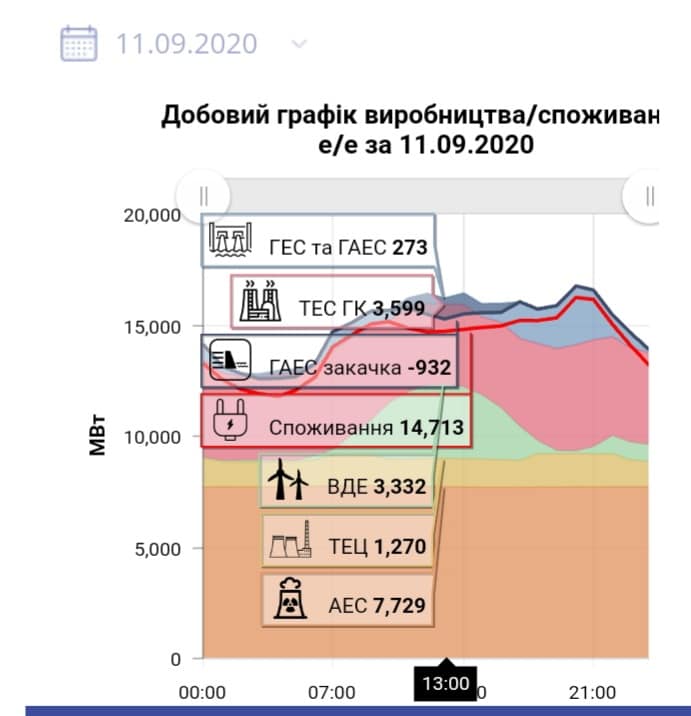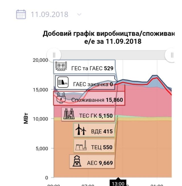 Все, що я описала вище, можна побачити на графіку роботи енергосистеми 11 вересня 2018 року. Тоді енергосистема працювала оптимально і логічно. Найбільше помаранчеве плато на графіку – потужна генерація атомки. Блакитна гора на графіку – це генерація «гідро», яка покривала круті вечірні піки споживання. А темно фіолетова западина в нічні часи – це «закачка» водосховищ-акумуляторів.