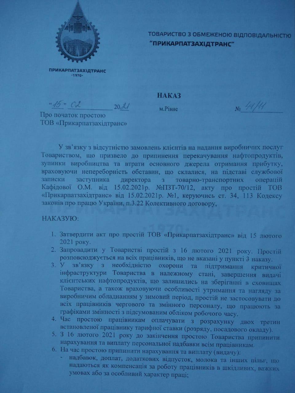Це наказ 41/11 від 15.02.2021 року, за підписом директора О.В. Левченко, згідно якого з 15 лютого 2021 року затверджується простій в роботі ТОВ "Прикарпатзахідтранс". Причина простою – відсутність замовлень клієнтів на надання виробничих послуг товариством.