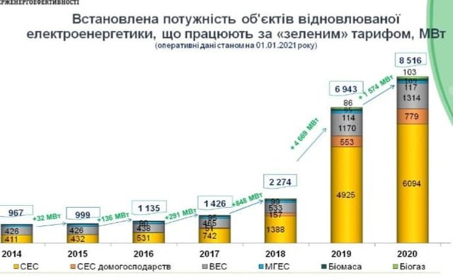 Черговий поріг зниження «зеленого тарифу» Україна проходила рік тому - 1 січня 2020 року. І за місяць, що передував цьому, в країні просто вибухово виникла величезна потужність СЕС. В той час міністерство палива в уряді Гончарука очолив головний лобіст «зеленої енергетики» Олексій Оржель – керівник Української асоціації відновлювальної енергетики, яку в часи Януковича створив Льовочкін. Зверніть увагу, як відпрацював «зелений» лобіст: потужності СЕС за час його керування міністерством зросли вдвічі (додалося аж 2.5 ГВт).