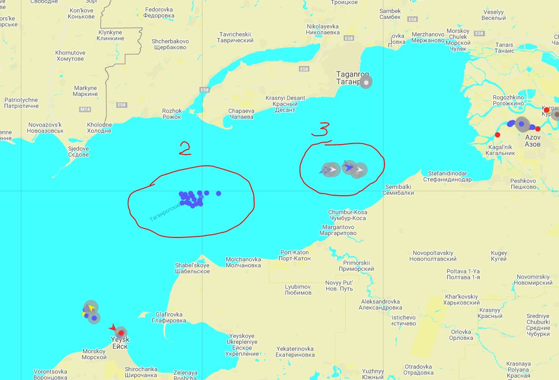 (2) На фото 2 - ситуація в Таганрогській затоці: група суден більше 20 чогось чекає (помітка 2) і невеличка група суден йде до Ростова (помітка 3).