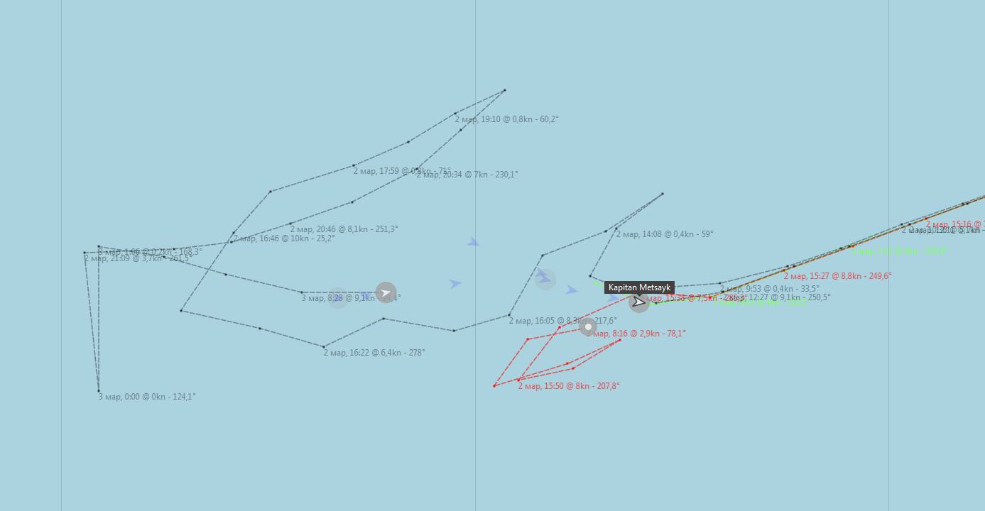 (3) На фото 3 показана 3-я група суден: там 3 криголами, які з 16-00 2 березня намагаються провести 10 суховантажів до Ростова... Можна побачити, які художні траєкторії вони там описують...