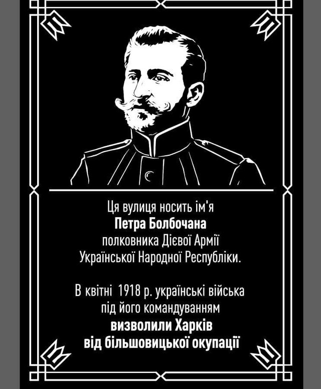 8.ІV.1918 українські війська під командуванням полковника Петра Болбочана визволили Харків. Це було перше звільнення міста від більшовиків. І саме ця дата найбільше заслуговує на звання Дня міста. Втім, сьогодні про це нажаль відомо мало. Особливо харків'янам. Для того, щоб популяризувати фігуру полковника-визволителя Слобожанщини, більше десятка громадських організацій звернулися до Харківміськради з пропозицією встановити меморіальну дошку Болбочану на вулиці, яка названа його іменем. Чиновництво відповіло бюрократичною відмовою в стилі "ми і так уліцу назвалі, хватіт етава". У 2014 ці бюрократи без сумніву були готові працювати під триколорами хоч РФ, хоч ХНР. Але тоді Харків в Україні лишився завдяки Nашій боротьбі. Нажаль лишилися тоді і бюрократи. Але прийде час не буде і їх. А от меморіальна дошка Болбочану на харківській Холодній горі обов'язково буде. А згодом буде і пам'ятник в центрі міста. Безсумнівно.