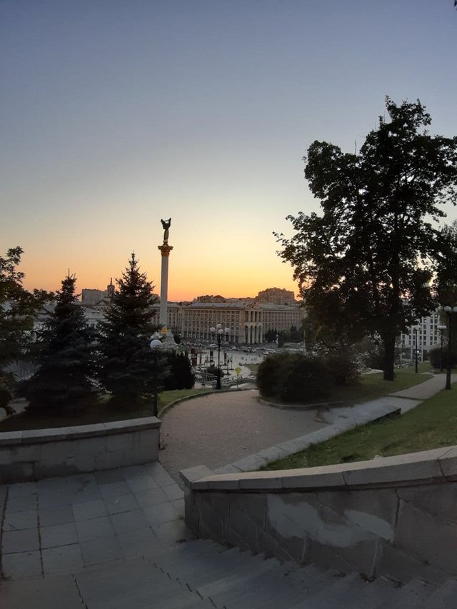 📷 На фото - вечірній майдан, вигляд головної площі країни зі сходів до Жовтневого палацу. Алея Героїв Небесної сотні. Світлина весни-2021.
