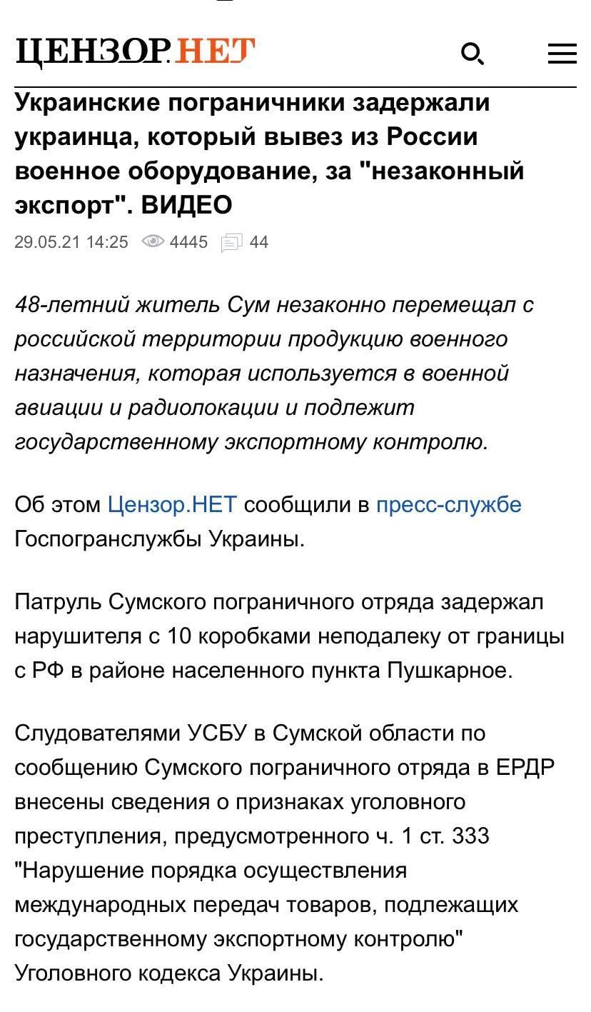 Глазам своим не поверил. Госпогранслужба официально заявила, что 28 мая задержала при переходе границы гражданина Украины, который переносил из России большой груз деталей военного назначения для авиации и радиолокаторов.