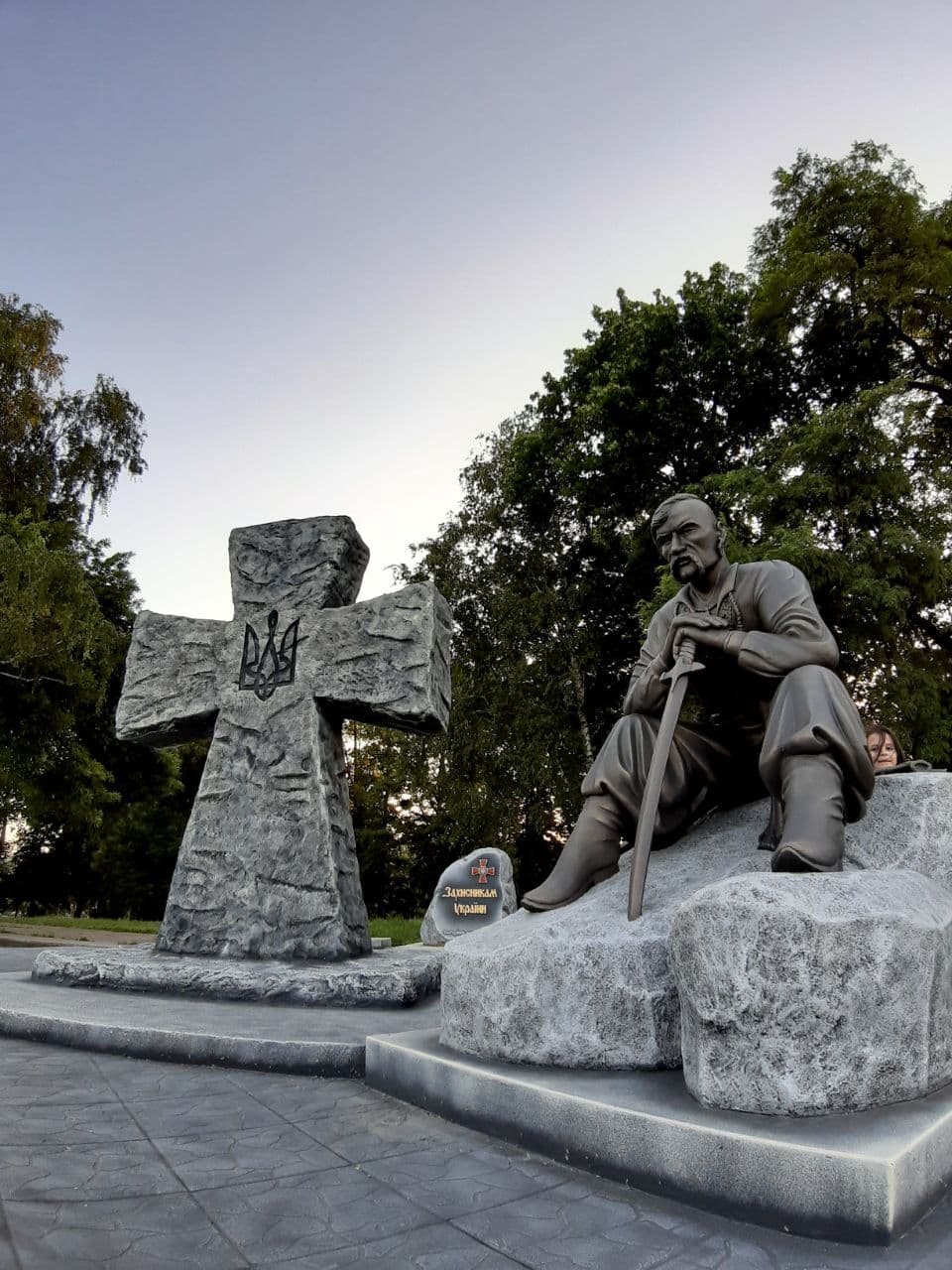 У Охтирці на Сумщині на місці, де колись стояв бовван Леніна відкрито новий пам'ятник. Скульптурна композиція захисникам України. Охтирський козак спирається на шаблю поряд з хрестом. Козацька форма хреста і розташування тризуба в перехресті майже ідентичні тим, які встановлювалися «Пам'яттю Nації» по всій Україні. На Сумщині таких хрестів ми встановили більше десяти. Тепер їх встановлюємо не ми. Наразі ця традиція стихійно шириться країною. І це добре.