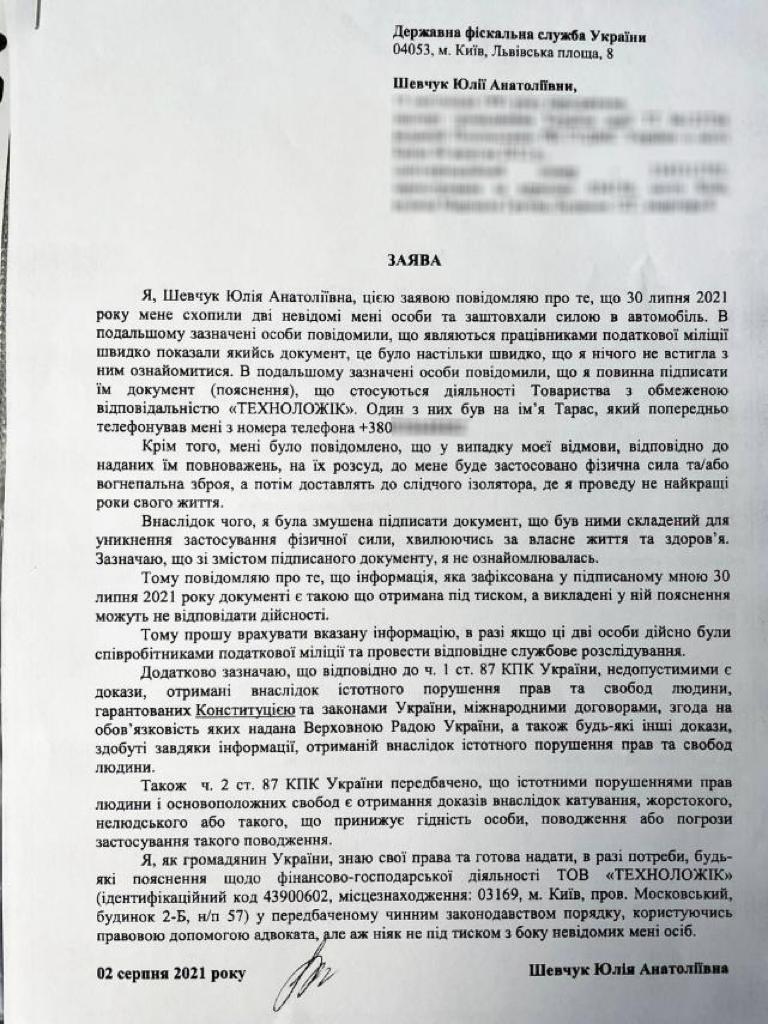 30 июля двое неизвестных в Киеве затолкали женщину в автомобиль, угрожали оружием, обещали пытать и отправить в СИЗО, если она не подпишет некое объяснение. Нападавшие представились сотрудниками налоговой милиции и требовали от испуганной жертвы подтвердить компрометирующие показания против ТОВ "ТЕХНОЛОЖІК", в котором она работает. Понятно, что другого выхода, чем выполнить требования правоохранителей-злоумышленников у женщины не было. Об этом стало известно из заявления потерпевшей в центральный офис ГФС.