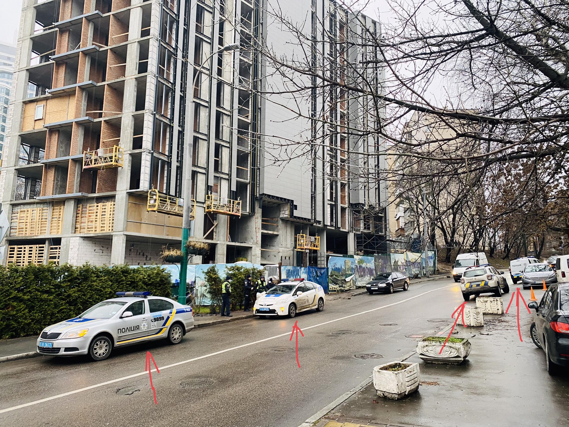 А що правоохоронні органи? Ось вони! Чотири автомобілі, в котрий раз, приїхали на виклик будівельників, щоб угамувати місцевих активістів.