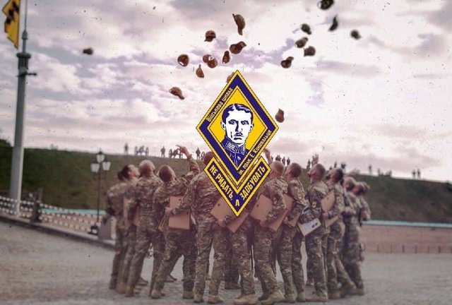📷 На фото – випуск Азовської сержантської школи, що носить ім’я засновника і першого провідника ОУН. Світлина зроблена на плацу Київській фортеці (Косий Капонір) восени 2016. На передньому плані – емблема школи, в основі якої портрет полк.Є.Коновальця.