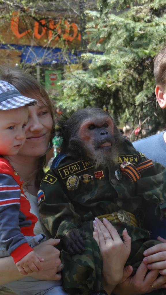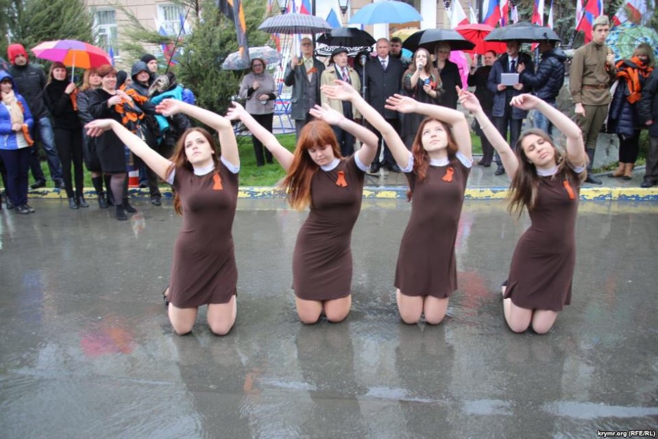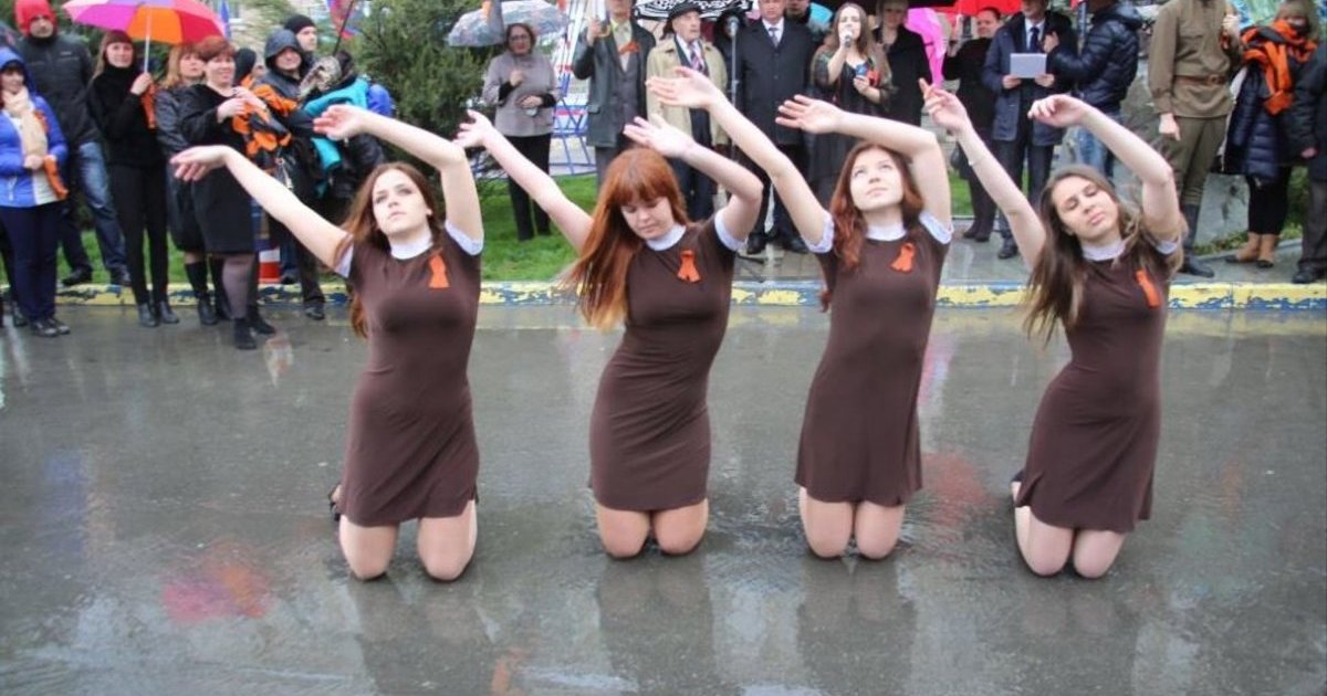 На третьем снизу фото, там где несут плакат "За деда загрызу", с плачущим "ветераном", это довольно известная в Москве личность, ветеран по вызову Лев Гицевич, 1928 г.р. То есть в 1945 ему было 16-17 лет.