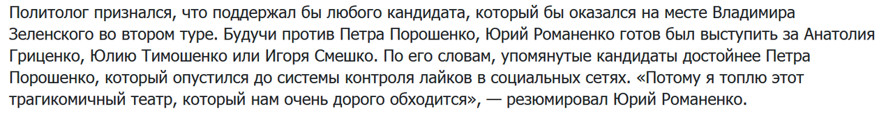 Я знаю (див вище). Романенко аж ныякий не українець. Ватник-малорос. Але думка вірна і тренд треба підтримати, я думаю. Тим більше, що сам Романенко значно менше зло, ніж відверті вороги України на кшталт Гетьманцева