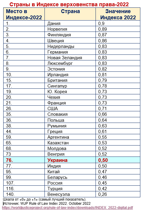 В Индексе-2022 Украина ухудшила своё положение на два места, заняв 76-ю позицию с показателем 0,5 баллов. Получается, что более чем на 30 лет страна построила только половину правого фундамента мира, благополучной экономики и процветающего общества. Украина впервые попала в рейтинг Индекса верховенства права в 2011г. Тогда она была на 57-м месте из 66 стран с показателем 0,32 балла. Получается, что период 2011-2022гг. Украина практически не работала над укреплением правовых институтов.