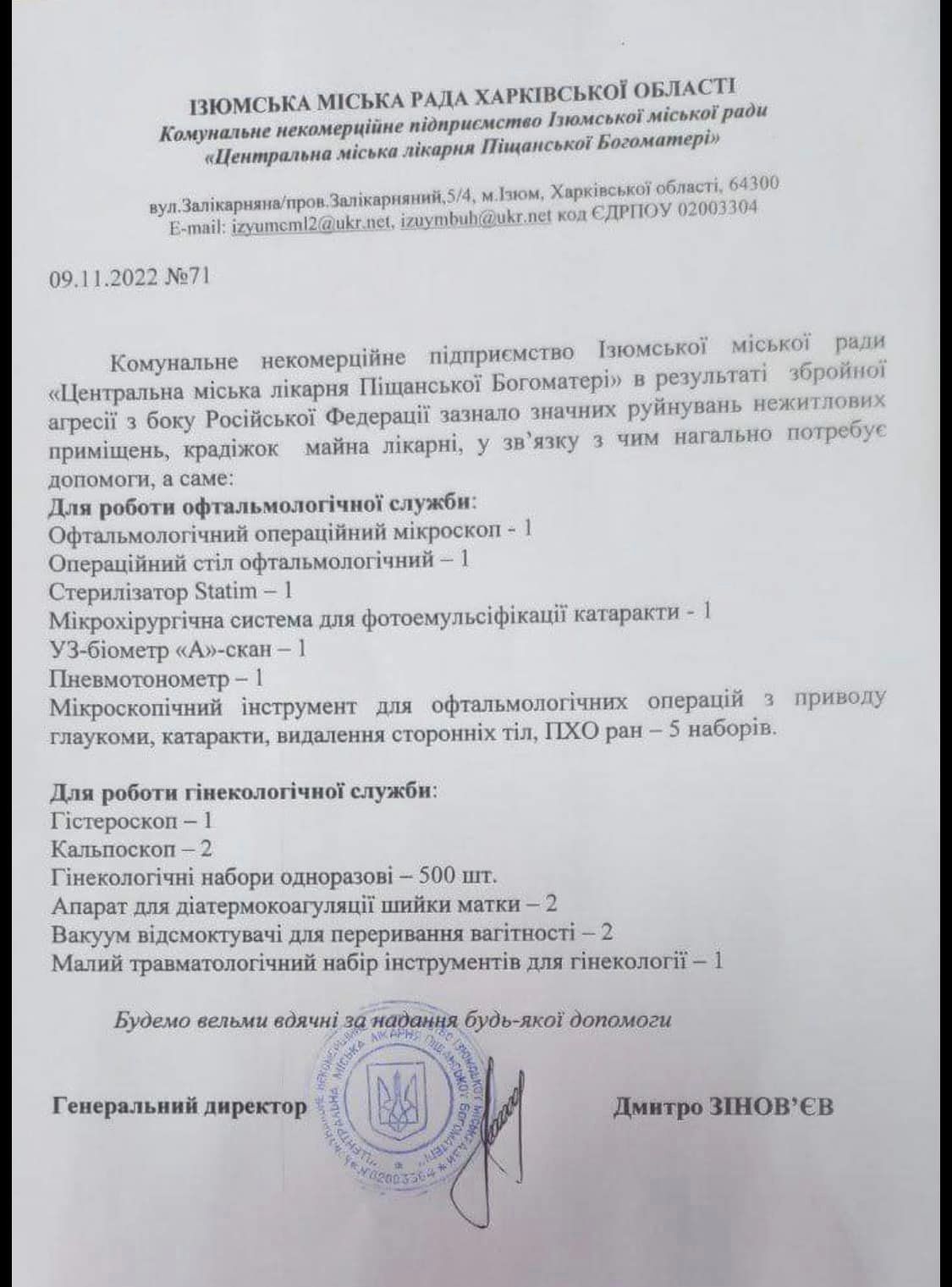 Окремо потреби лікарні в їх офіційному листі. Давайте допоможемо