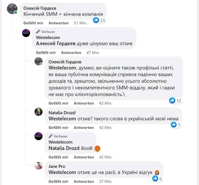 Коли ж у коментарях до цієї публікації користувачі спробували пояснити, що у європейській країні спілкування з клієнтом має проводитись у іншій тональності, SMM-менеджер Westelecom почав грубити коментаторам і масово їх банити (автор цього блогу забанений теж).