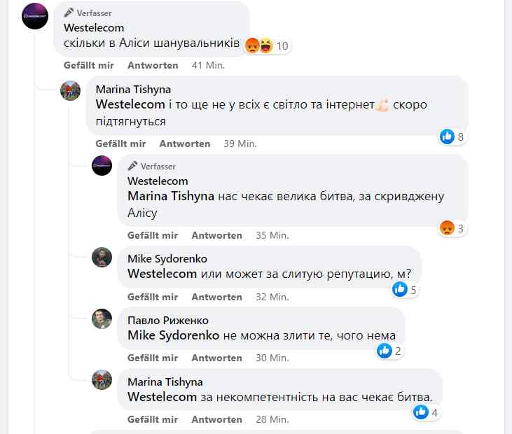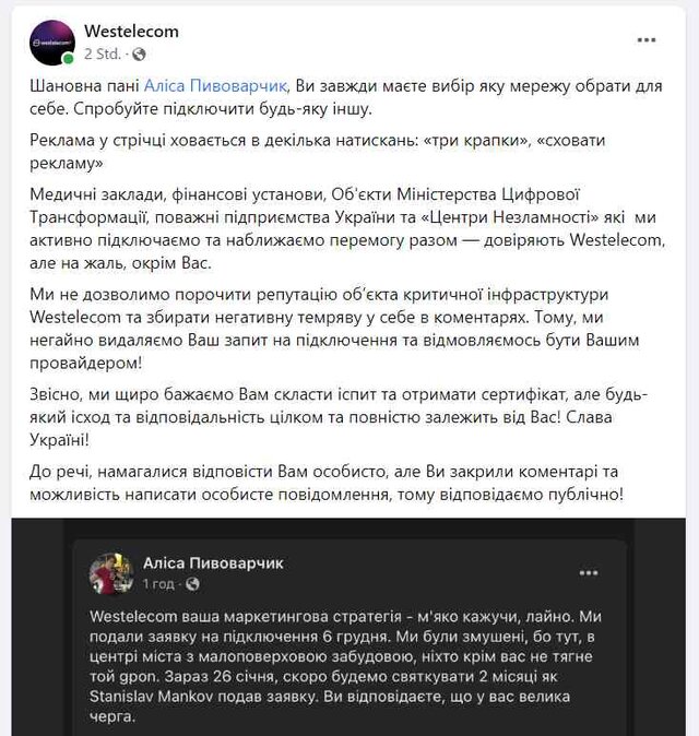 Представник компанії виправдовувався, що фірма перевантажена замовленнями. Однак, як помітила Пивоварчик, Westelecom активно агітувала підключатись через рекламу у Facebook. "Мене, як клієнта, який змушений чекати - скільки ще місяців? - на ваші послуги, просто шалено бісить, що ви продовжуєте залучати нових клієнтів", - резюмувала вона.