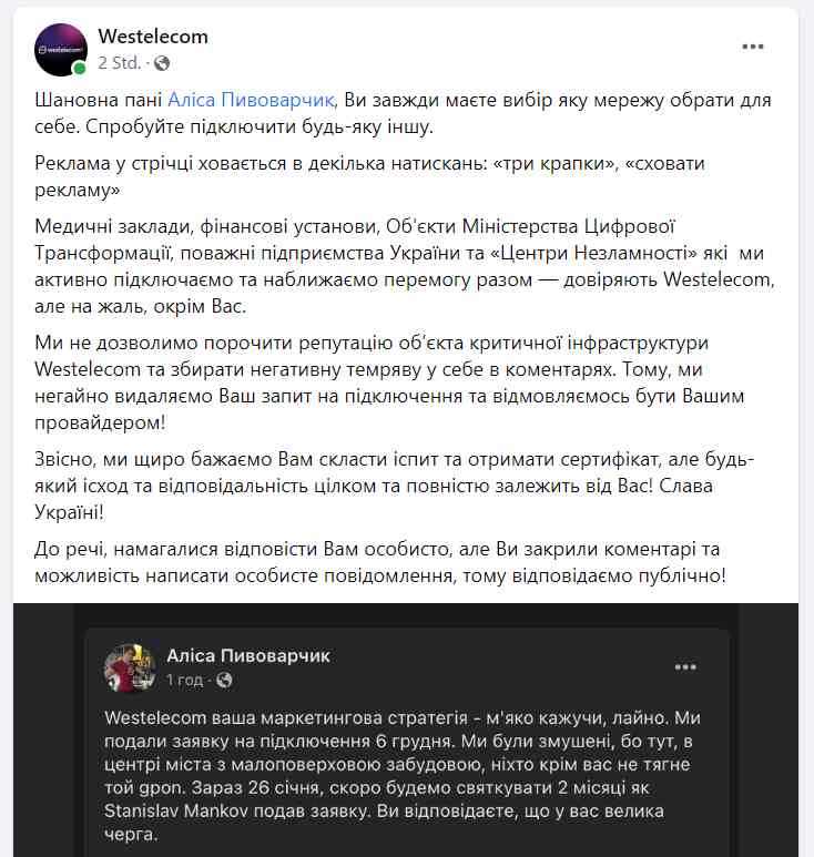 Історія так і залишалась би сірою і непомітною, якби не специфічний підхід Westelecom до публічних комунікацій. За три години SMM-представництво бренду оприлюднило свою відповідь на скаргу Пивоварчик, заскрінивши її пост та у грубій формі відмовляючи їй у підключенні (пост компанії вже видалений - цікаво, чому?)).
