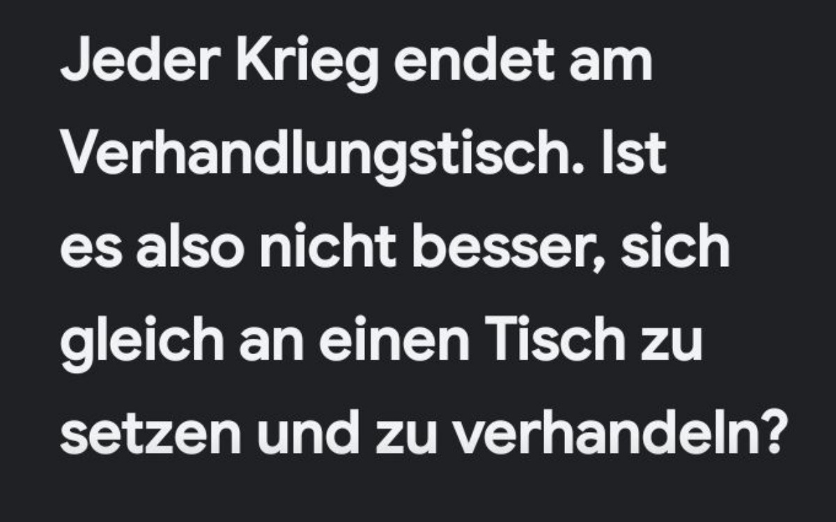 Натомість на підсилення прийшов ще один бісмаркознавець, надіславши нову «цитату»: «Будь-яка війна закінчується за столом перемовин. Чи не краще одразу сідати за стіл і домовлятись?». Думаю, як доказ її існування було надано зображення з цією фразою німецькою.