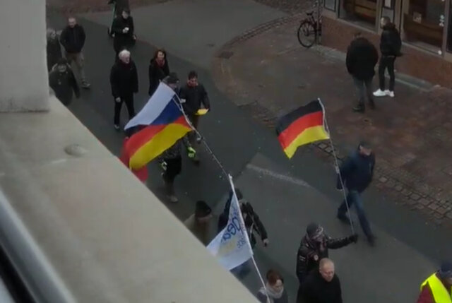 Прикінцева ремарка про прикрий сморід проросійської позиції. На жаль, в місті, де я знаходжуся, багато росіян. Тобто етнічних німців, родини яких радянська (чи краще писати «совєтська»?) влада турботливо запроторила в якісь глибини своєї найсправедливішої у світі країни, вихід з яких вдячні громадяни знайшли лише після 1991 року. Завдяки дивній політиці своєї надто демократичної та глибоко капіталістичної прабатьківщини. Вони виросли тут, спокійно переходять з німецької на російську, працюють у всіх закладах і установах. Вони місцеві. І за мир. Принаймні ті дві сотні людей, які ходять по центру міста ледь не щотижня з намальованими голубами та поділеним по діагоналі прапором з триколором двох типів.