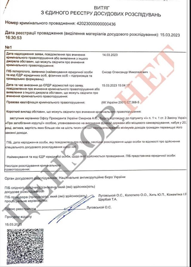 Минулого тижня стало відомо, що після резонансного журналістського розслідування щодо заступника Єрмака Андрія Смирнова Спеціалізована антикорупційна прокуратура врешті-решт порушила кримінальну справу та розпочала досудове розслідування щодо Смирнова за статтею 368-5 «Незаконне збагачення» Кримінального кодексу України.