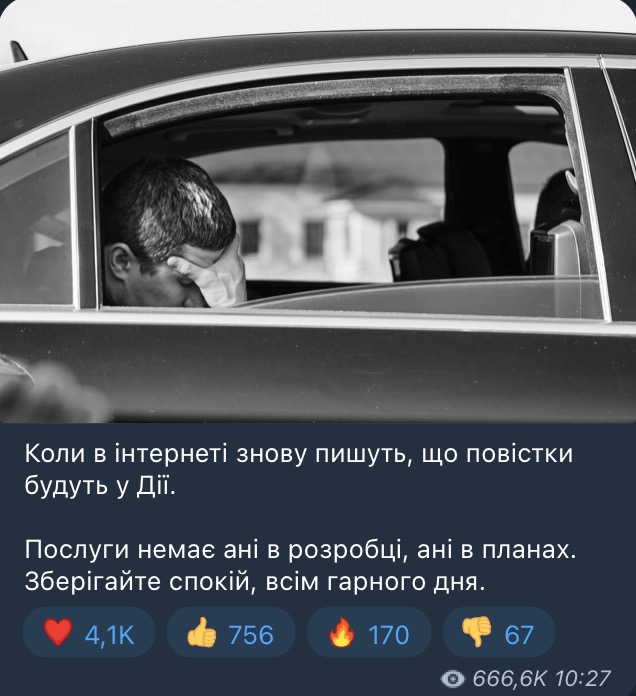 Я б хотів просто зафіксувати це твердження про військові повістки: «Послуги видачі повісток через додаток Дія немає ані в розробці, ані у планах».