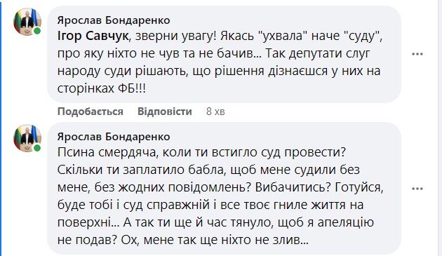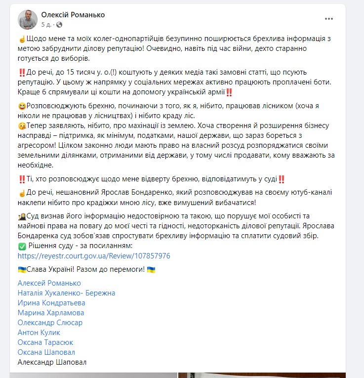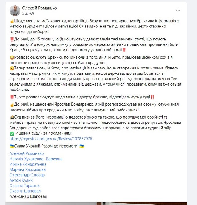 Як я зрозумів, зараз по персонажу працює НАБУ та інші правоохоронні органи, і відсидівшись з поки незрозумілим мені рішенням, Романько вирішив їм прикритись: "ось дивіться, мене очерняють, отой Ярослав Бондаренко, плати та вибачайся...