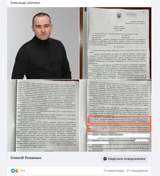 Друзі, випадково, з допису зашквареного ЗЕдепутата Олексія Романько, який мені скинули друзі з Шостки, я дізнався, що нібито програв якийсь суд, та повинен вибачитись перед персонажем та ще сплатити йому 50 тис за "честь та гідність", якими по факту у горе-депутата ніколи й не "пахло"...