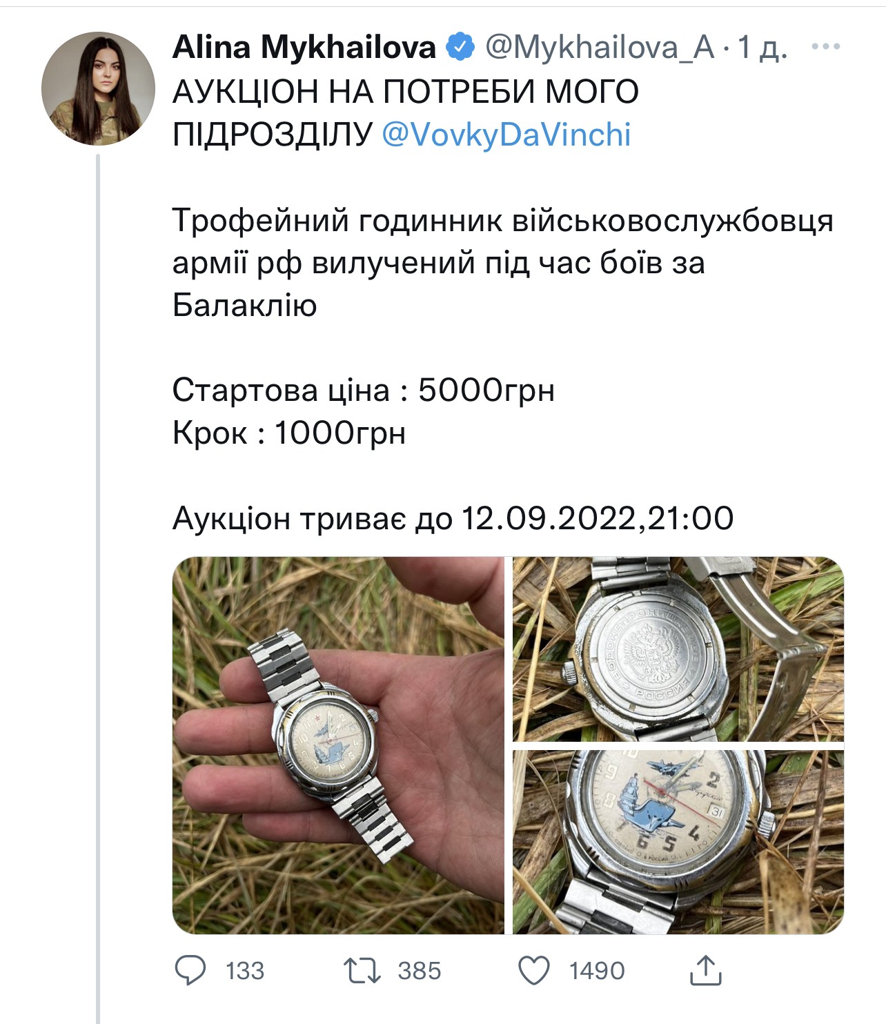 Зокрема, депутатка https://twitter.com/mykhailova_a/status/1568958892205551617?s=21&t=ClkOJVY8PXM52nkk0y3Rlg виклала у своєму Twitter годинник, https://bigkyiv.com.ua/godynnyk-ta-shevrony-okupantiv-dopomozhut-zsu-deputatka-kyyivrady-vystavlyaye-trofeyi-na-aukczion/ знятий з ліквідованого ЗСУ окупанта РФ у Балаклії та оголосила аукціон зі стартовою ціною у 5000 грн.