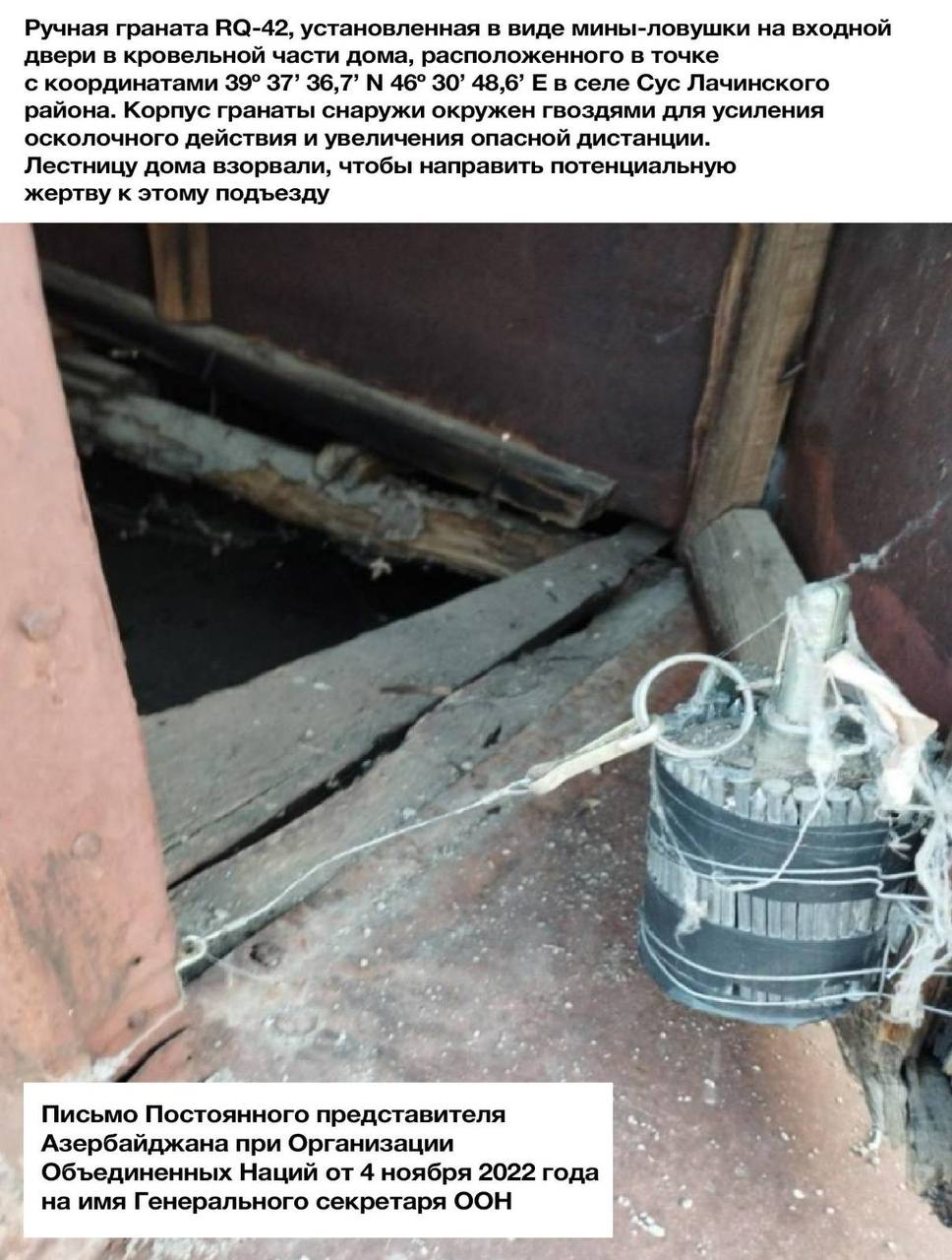 У листі голови Азербайджану Джейхуна Байрамова на ім'я Генсека ООН йдеться про продовження у Вірменії формування нових бойових позицій на території Азербайджану, де тимчасово розміщено контингент Російської Федерації, а також проведення інженерно-фортифікаційних робіт і в цьому контексті встановлення великої кількості мін. Присутність цього контингенту суттєво обмежила роботи з розмінування.