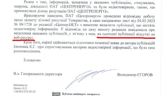 Попри докази, документи, заяви членів наглядової ради Товариства, Єгоров тримав удар, за ним стояли серйозні сили і він до певного часу почував себе недосяжним. Єгоров, навіть надіслав листа у Фонд держмайна, в якому запевнив керівництво, що з Ільченко вже розібрався, що "порешал" з Цензор.НЕТ і мої публікації вже зняті з блогу.
