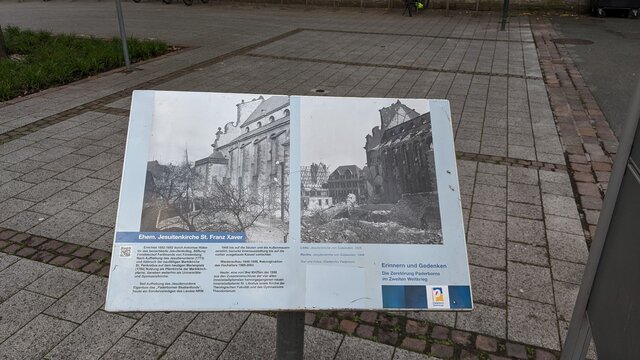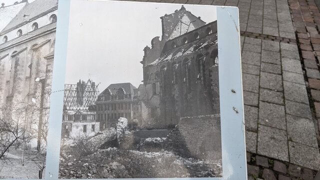 Але зараз не про це. На тій самій табличці бачимо, що у 1949-1958 роках відновили будівлю, головний вівтар — у 1989-2003-му. Якщо покопирсатися у туристичних буклетах, можна побачити, що барокове внутрішнє оздоблення та інтер’єр відновлювали у 1990-х за фотографіями. Тобто щоб повернути довоєнний вигляд однієї конкретної церкви знадобилося майже 60 років. І багато грошей (приблизно 4 мільйони євро).