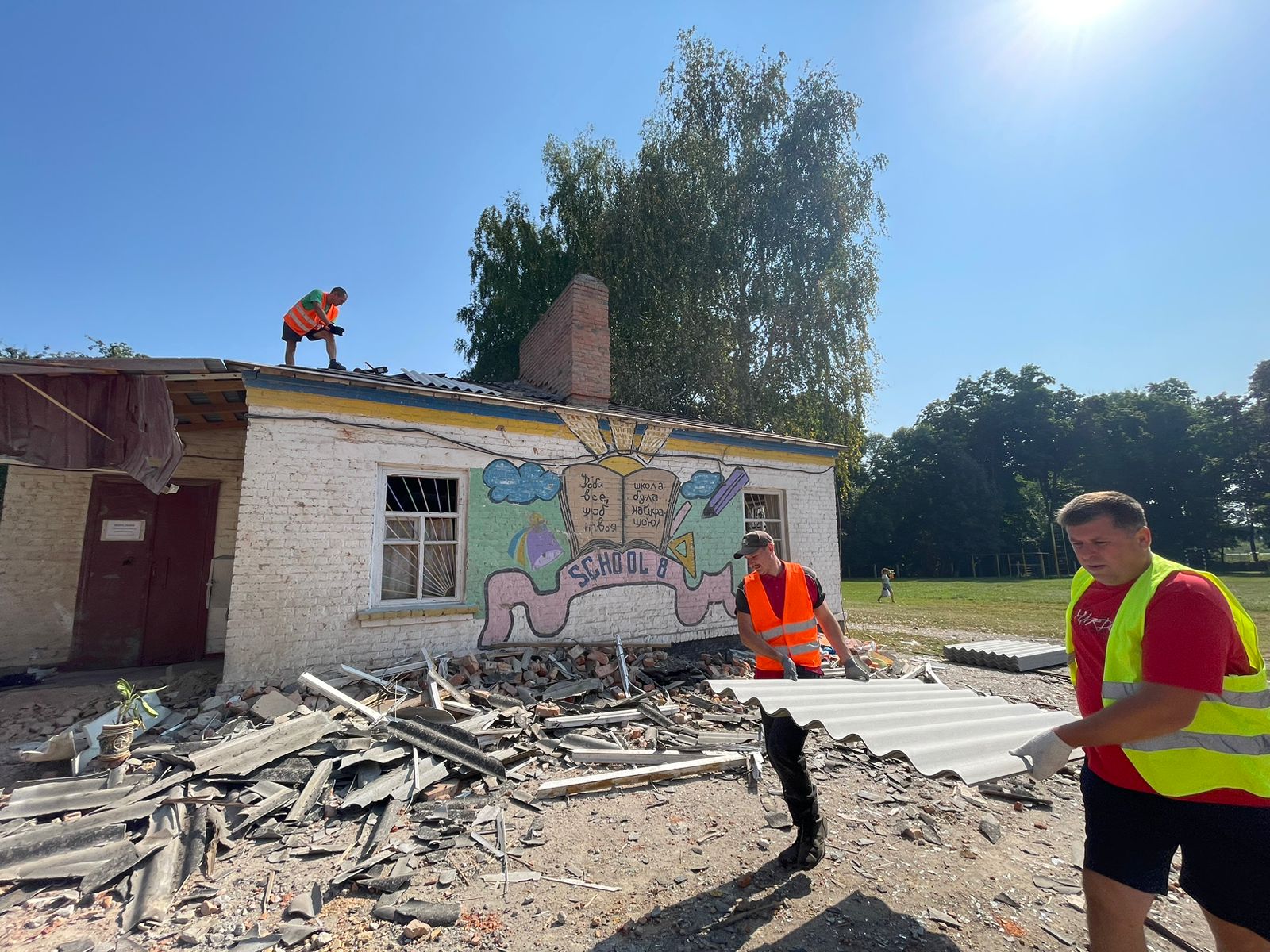 Ось і в Ромнах, щойно отримали дозвіл, ми взялися до роботи. Розпочали з відновлення даху складу-майстерні, яка встояла після удару. Школа №8 - опорна, і місцева влада ухвалила рішення відбудувати її.