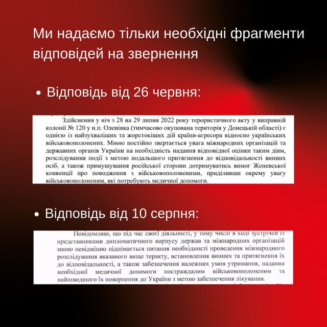 Окрім цього, повторну відповідь на наше звернення ми отримали 10 серпня 2023 року, у якій Дмитро Лубінець зазначив: “Повідомляю, що під час своєї діяльності, у тому числі в ході зустрічей із представниками дипломатичного корпусу держав та міжнародних організацій мною невідмінно піднімається питання необхідності проведення міжнародного розслідування вказаного вище теракту, встановлення винних та притягнення їх до відповідальності, а також забезпечення належних умов утримання, надання необхідної медичної допомоги постраждалим військовополоненим та найшвидшого їх повернення до України з метою забезпечення лікування.“
