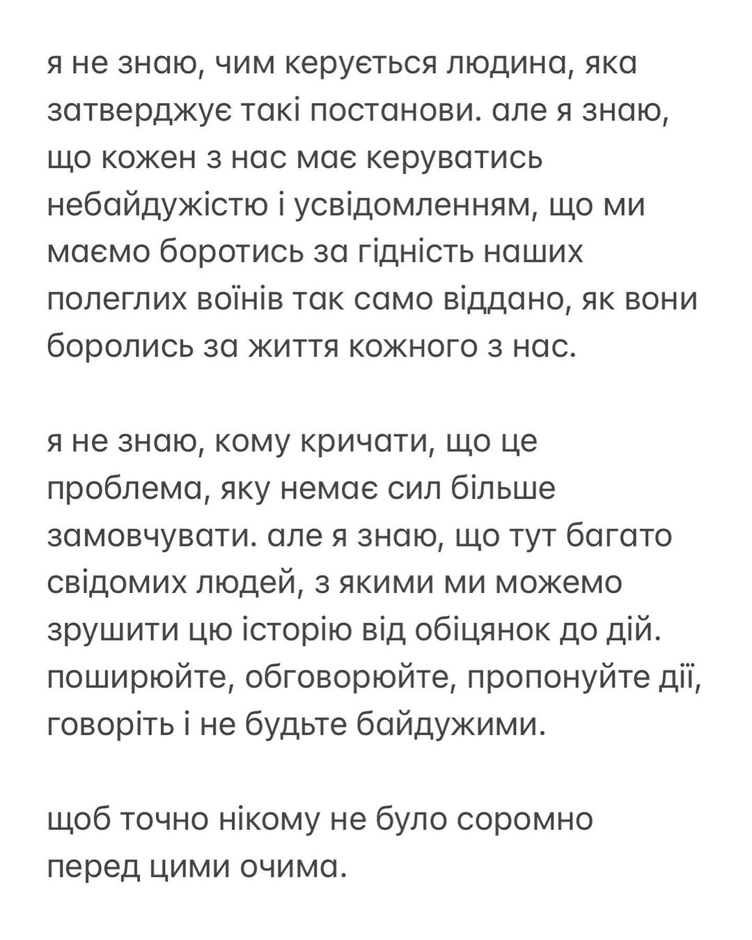 Я не розумію позицію держави, яка не шанує тих, хто віддав свої життя за неї. Це сором держави і це біль всіх сімей загиблих.