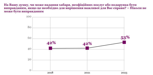 Рівень нетерпимості корупції в Україні (джерело: Програма сприяння громадській активності «Долучайся!» спільно з Проєктом USAID «Підтримка організацій-лідерів у протидії корупції в Україні «ВзаємоДія» (SACCI)