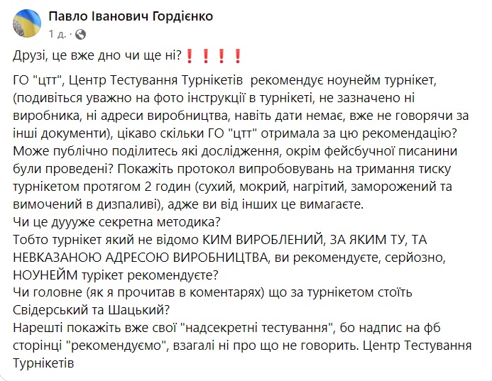 Як колишній начальник відділу військово-дослідних випробувань ГУРСМЗ ЗСУ, який розуміється в процедурі випробувань, я хотів би мати відповіді на всі питання вище, а також відкриті біографічні данні засновників цього Центру, які в якусь мить стали «експертами» з тактичної медицини. Можливо я помиляюсь, тож буде цікаво подивитись компетентність тих, хто щось "рекомендує". Чи це лише особиста думка?