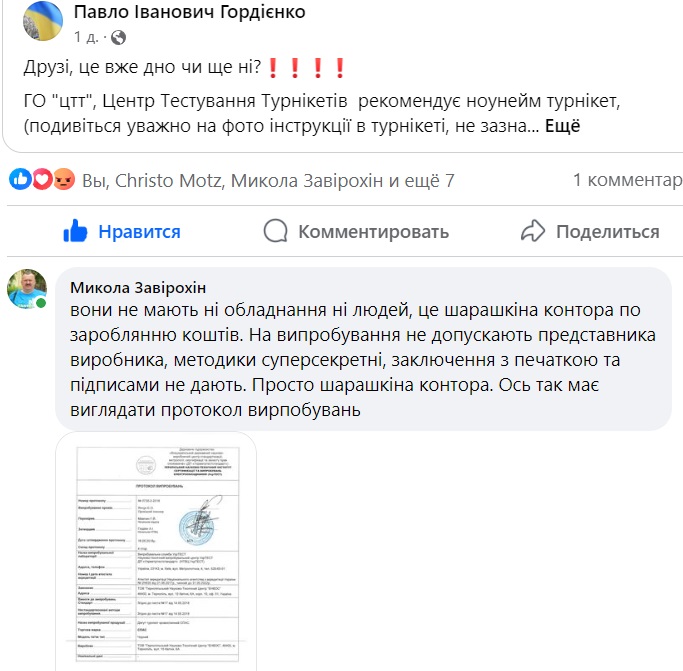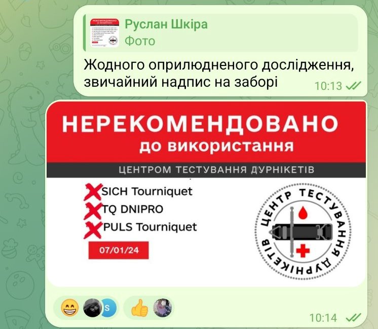 Ті висновки з «рекомендаціями» на сторінці Центру тестування турнікетів, який досі не показав сертифікованого обладнання, методики тестувань і актів по «піддослідним» турнікетам, варті навіть менше ніж фотошоп розміщений нижче, який гуляє по телеграм каналам медичних фахівців.