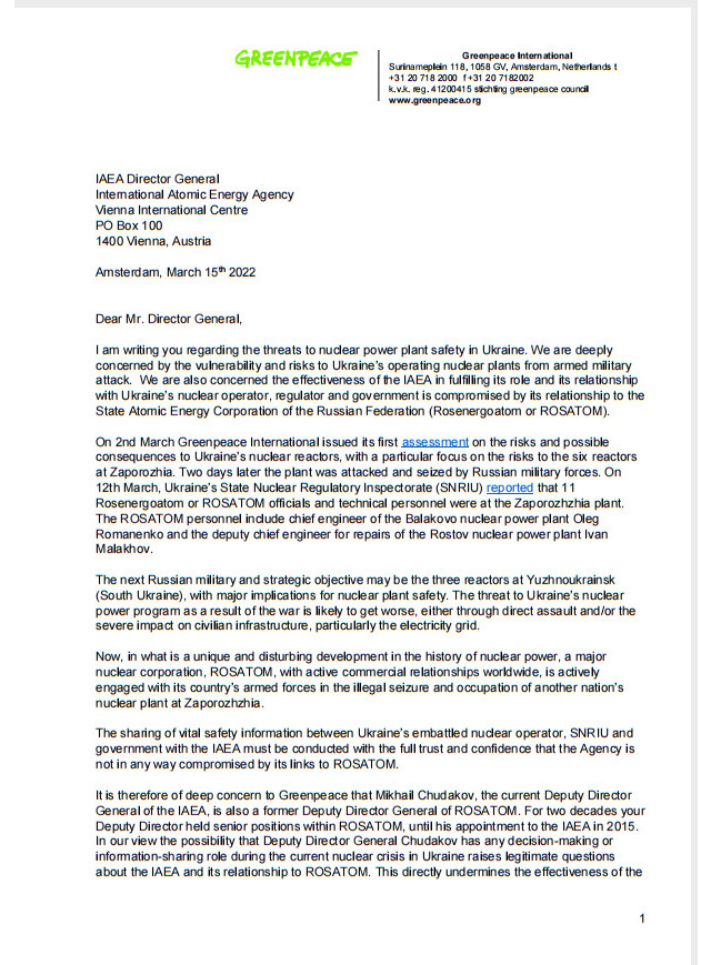лист Грінпісу до МАГАТЕ від 15.03.2022
