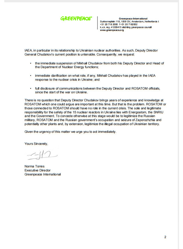 Грінпіс писав (скрін листа в кінці тексту): “Зараз, в унікальному і тривожному розвитку подій в історії ядерної енергетики, велика ядерна корпорація "Росатом”, що має активні комерційні зв'язки по всьому світу, активно співпрацює зі збройними силами своєї країни у незаконному захопленні та окупації атомної електростанції іншої країни в Запоріжжі. Обмін життєво важливою інформацією з питань безпеки між українським оператором атомної енергетики, Держатомрегулюванням та урядом України і МАГАТЕ має відбуватися в умовах повної довіри та впевненості в тому, що Агентство жодним чином не скомпрометоване своїми зв'язками з "Росатомом". Тому Грінпіс глибоко стурбований тим, що нинішній заступник голови МАГАТЕ Михайло Чудаков є також колишнім заступником генерального директора "Росатома". Протягом двох десятиліть ваш заступник директора обіймав керівні посади в "Росатомі" до свого призначення в МАГАТЕ в 2015 році. На нашу думку, можливість того, що заступник генерального директора Чудаков має будь-яку роль у прийнятті рішень або обміну інформацією під час нинішньої ядерної кризи в Україні, викликає законні питання щодо МАГАТЕ та його відносин з "Росатомом". Це безпосередньо підриває ефективність МАГАТЕ, зокрема у відносинах з українськими ядерними відомствами. У зв'язку з цим, заступник генерального директора Чудаков є неприйнятним для подальшого перебування на цій посаді”. Грінпіс прямо вимагав відставки Чудакова та “негайного роз'яснення, яку роль, якщо така була, Михайло Чудаков відігравав у МАГАТЕ реагуванні на ядерну кризу в Україні; та повне розкриття комунікації між заступником директора та посадовими особами "Росатома", з моменту початку війни в Україні”. Очікувано, що МАГАТЕ на цю ноту не відповів і ігнорив.
