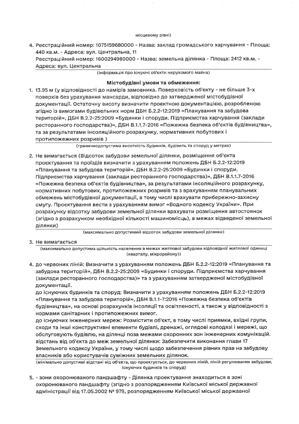 Для реконструкції об’єкта будівництва ТОВ "КОЗАЧОК ОСОКОРКИ" надано містобудівні умови та обмеження № 373 від 19.03.2021 для реконструкції закладу громадського харчування на вул. Центральній, 11 у Дарницькому районі м. Києва (документ, що містить комплекс планувальних та архітектурних вимог до проектування і будівництва, та є одним із складових вихідних даних для проектування). В містобудівних умовах та обмеженнях зазначені норми щодо обмеження поверховості будівництва - не вище 13.95 метрів та не більше 3-х поверхів без урахування мансарди. Також ділянка потрапляє на прибережну захисну смугу об’єкта водного фонду. Нагадаю, що відповідно до водного кодексу капітальне будівництво в прибережних смугах заборонено.