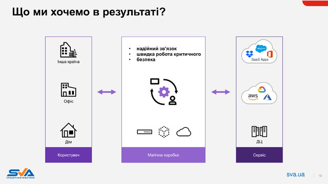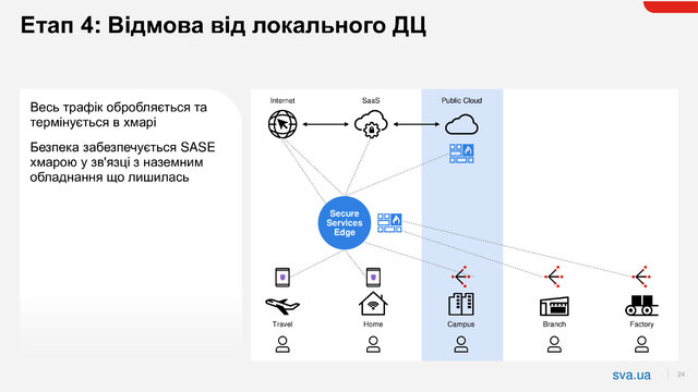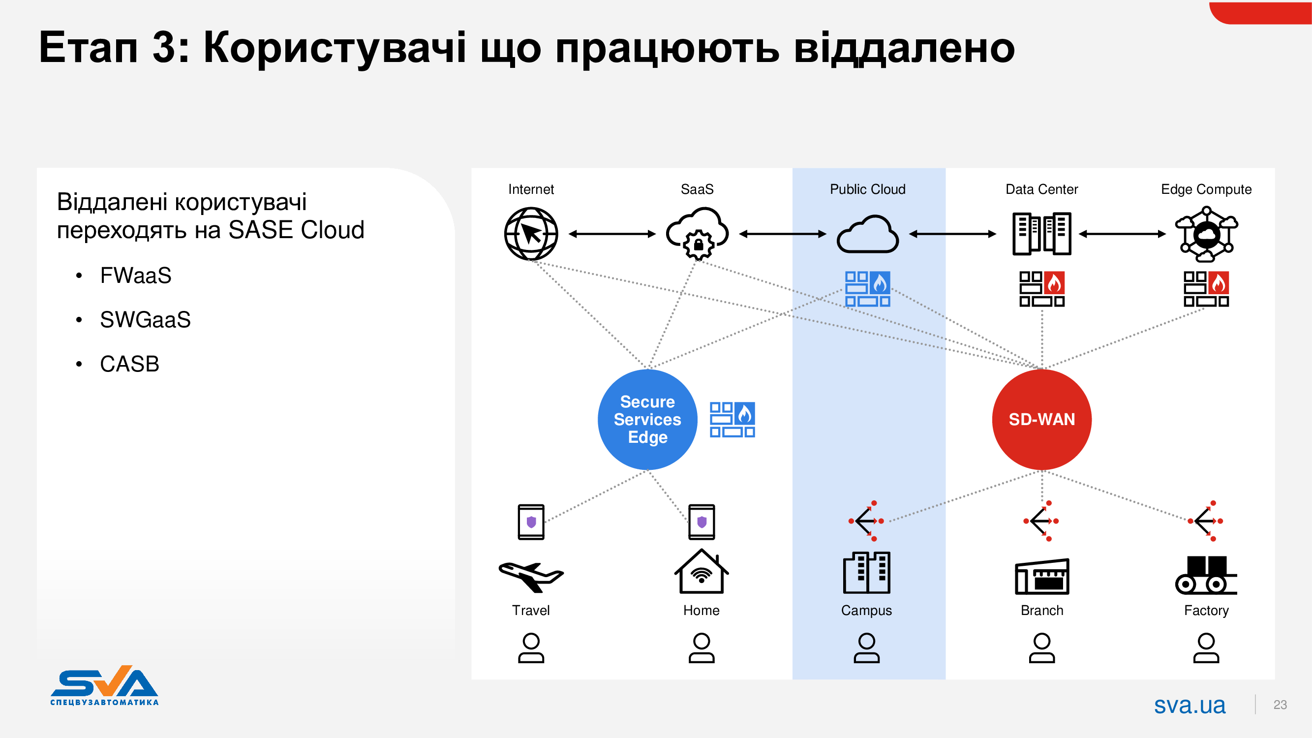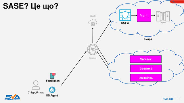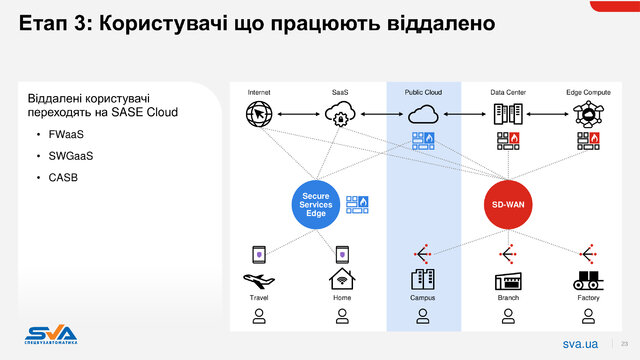 SASE-рішення створюють такий сценарій: користувачі підключаються у SASE-хмару, а далі вона вже робить інтерконнет з SaaS-сервісами і з вашим дата-центром. Отже, певний хмарний сервіс може займатися безпекою і підключеннями.