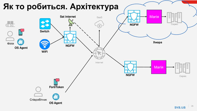 Приклад архітектури: один-два дата-центри, параметральні пристрої, безпека сервісу і співробітники, які підключаються до них з агентом і двофакторною автентифікацією через мережеве обладнання.