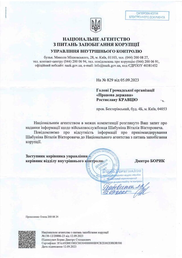 Що стосується ймовірної підробки документів, то тут Шабунін В.В. повинен завдячити НАЗК, яке листом №829 від 05.09.2023 повідомило, що у НАЗК відсутня інформація про прикомандирування Шабуніна Віталія Вікторовича до Національного агентства з питань запобігання корупції. От і ч.1 ст.358 ККУ. Тому, про електронний документообіг хай Шабунін розповідає комусь іншому.