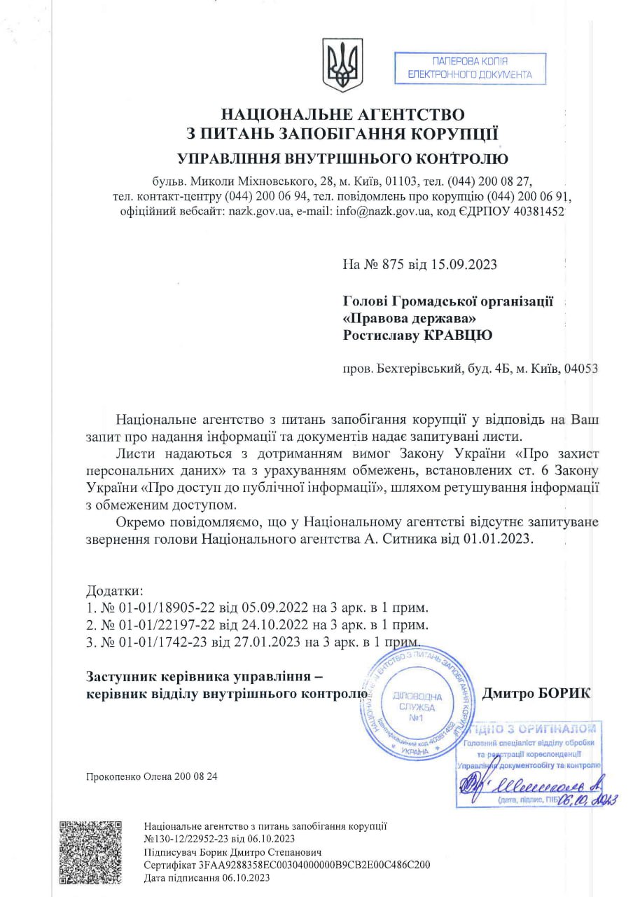 Після того, як вони намагались скрити, були направлені нові запити і нарешті, після продовження розшуку в електронних документах, НАЗК знайшло та надало відповідь. Правда там зазначили, що у своїх документах вони не знайшли звернення заступника голови НАЗК Ситника А. від 01.01.2023.