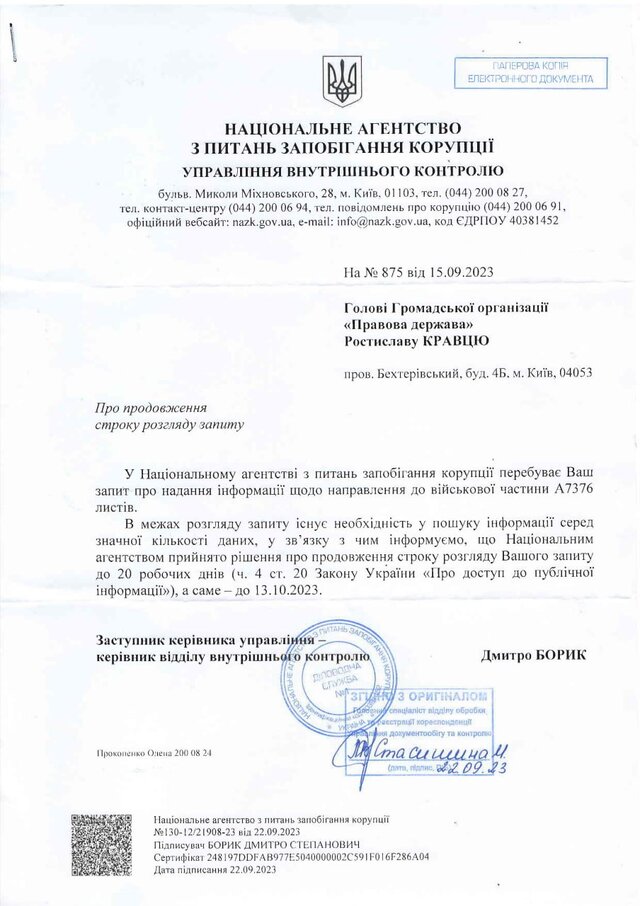 Лист НАЗК про продовження строку пошуку листів НАЗК щодо відкомандирування до них Шабуніна В.В.
