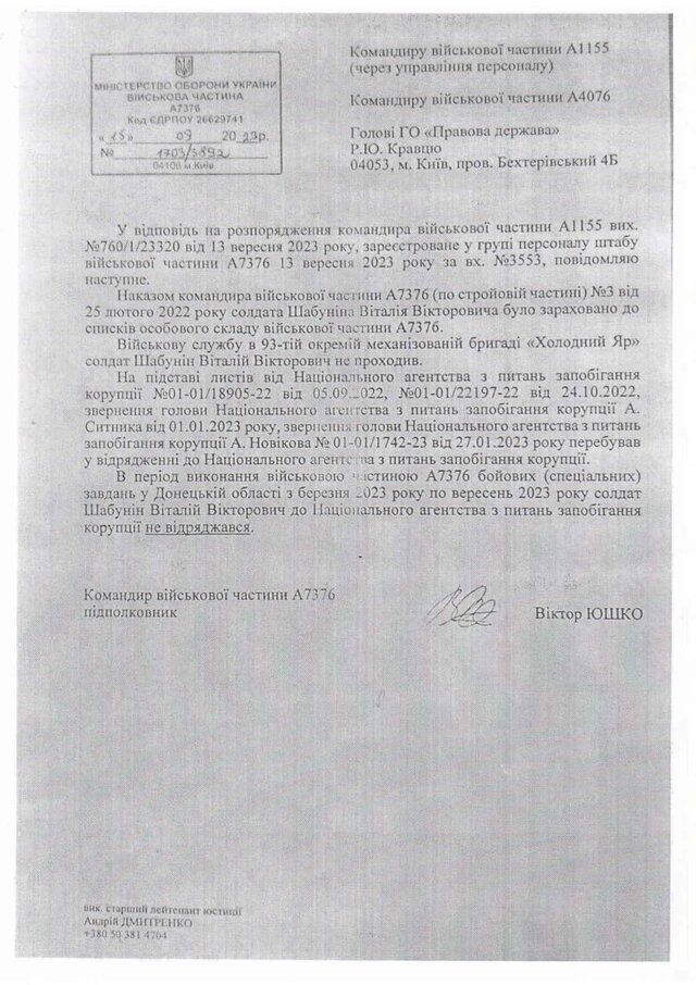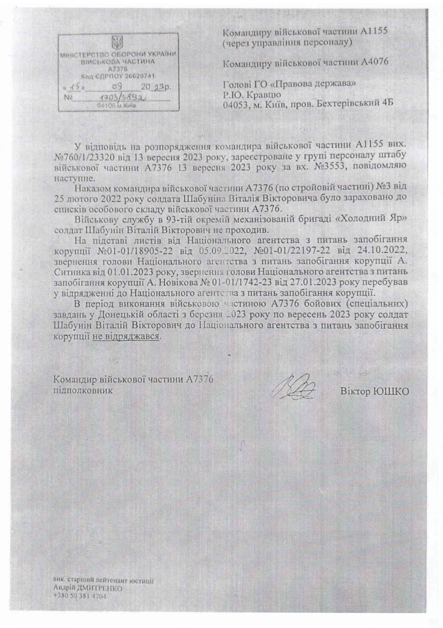 Відповідь військової частини А7376 щодо проходження солдатом Шабуніним В.В. військової служби у НАЗК